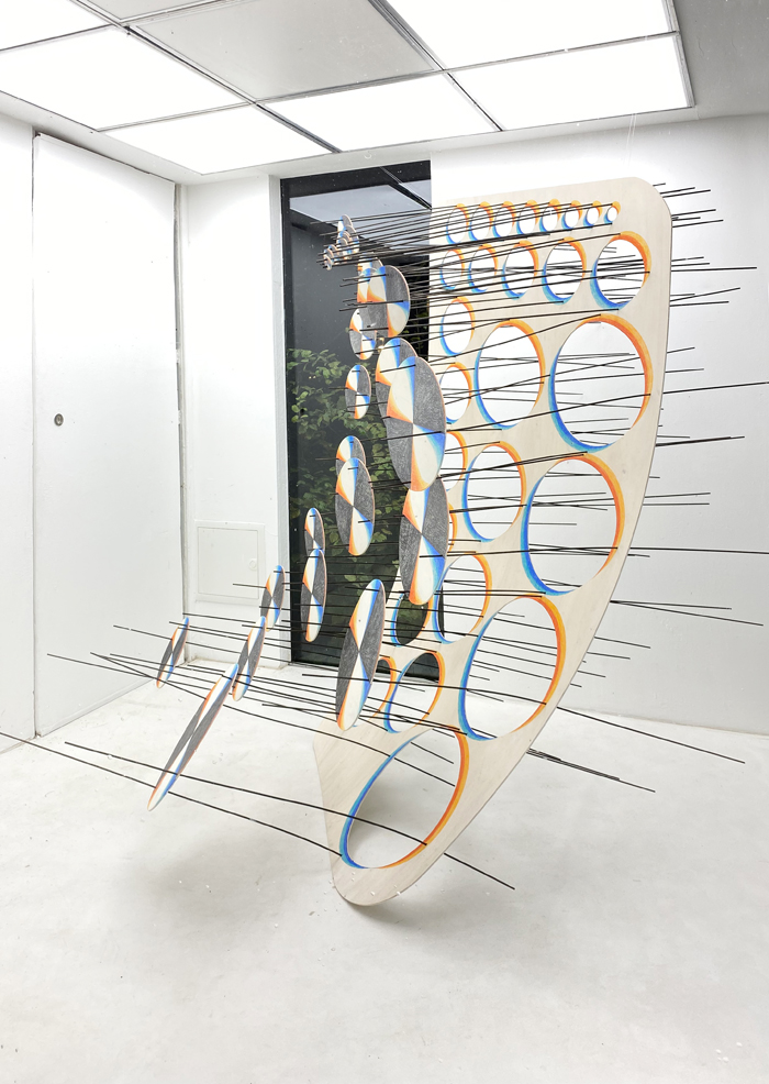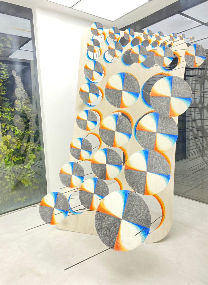 2022 · Buntstift und Bleistift auf Sperrholz, Holzrundstäbe · ca. 190 x 100 x 150 cm
